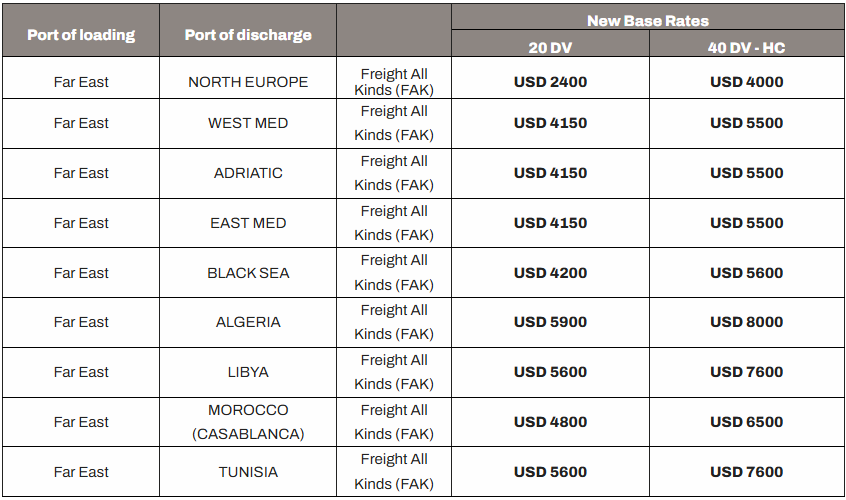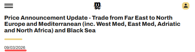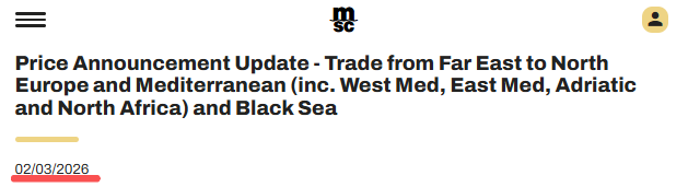 3月9日,地中海航运公司(MSC)发布公告称,自2026年3月22日起至另行通知为止(但不超过2026年3月29日),从所有远东港口(包括但不限于日本、韩国和东南亚的港口)到北欧、地中海(包括西地中海、东地中海、亚得里亚海和北非)以及黑海港口的运费将调整FAK费率如下: