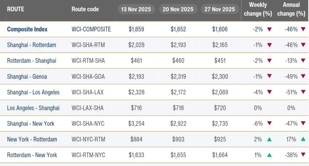 SCFI终止三连跌!WCI再次下探!11月28日,上海出口集装箱综合运价指数(SCFI)为1403.13点,较上期上涨 0.7%,终止此前连续3周下跌态势。其中,各航线走势分化明显,远洋航线有涨有跌,近洋航线整体平稳;Drewry世界集装箱运价指数截至11月27日,Drewry世...