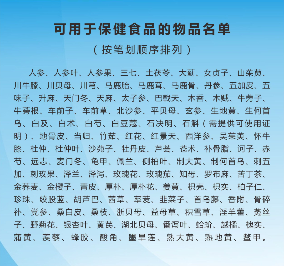 为了规范保健食品原料使用,原卫生部2002年3月11日发布《卫生部关于进一步规范保健食品原料管理的通知》(卫法监发〔2002〕51号),其中列明了《可用于保健食品的物品名单》和《保健食品禁用物品名单》。《可用于保健食品的物品名单》所列物品仅限用于保健食品。