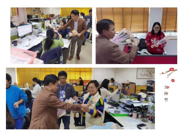公司为了表达对女同胞们的特别关爱以及兢兢业业付出的感谢,同时丰富大家的业余文化生活,于3月7日上午,举行了女神节庆祝活动,由集团总裁Mark、物流中心总经理Peter以及各事业部主要男主管代表公司为一众女同胞送上鲜花与礼物。