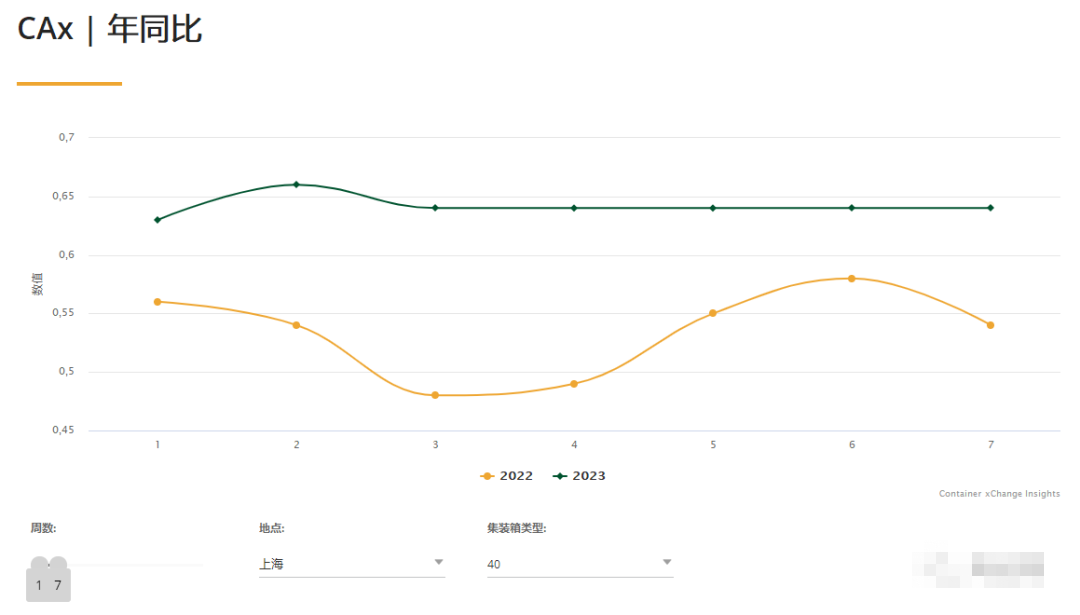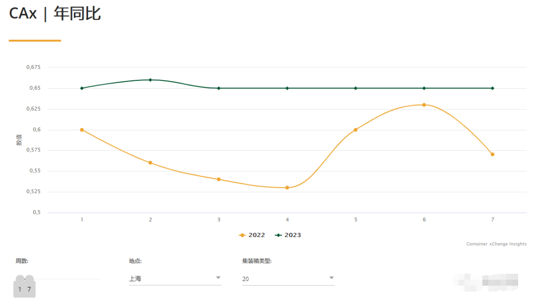 据全球集装箱租赁和交易平台Container xChange最新数据显示,上海20/40英尺集装箱CAx的数值均高于去年同期,其中第二周达到0.66,之后几周稳定在0.64,已经连续7周在0.6以上。作为对比,2022年第三周,上海40英尺集装箱CAx的数值只有0.48,最高时也仅为0.59。CAx指数高于0.5,意味着入港集装箱的数量大于离港集装箱的数量,容易造成空箱在港口堆积的情况。