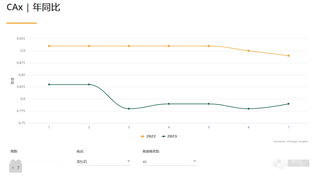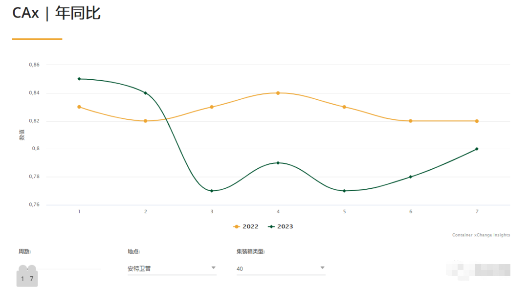 在美国洛杉矶港,空箱堆积情况虽然比2022年大幅好转,但相对于国内港口来说情况更为严峻。CAx指数显示,2023年前7周,洛杉矶40英尺集装箱CAx的数值维持在0.78以上,最高时达到了0.83。另外,北欧的安特卫普港等也在0.8以上,意味着欧美消费地港口空箱堆积情况超过国内水平。