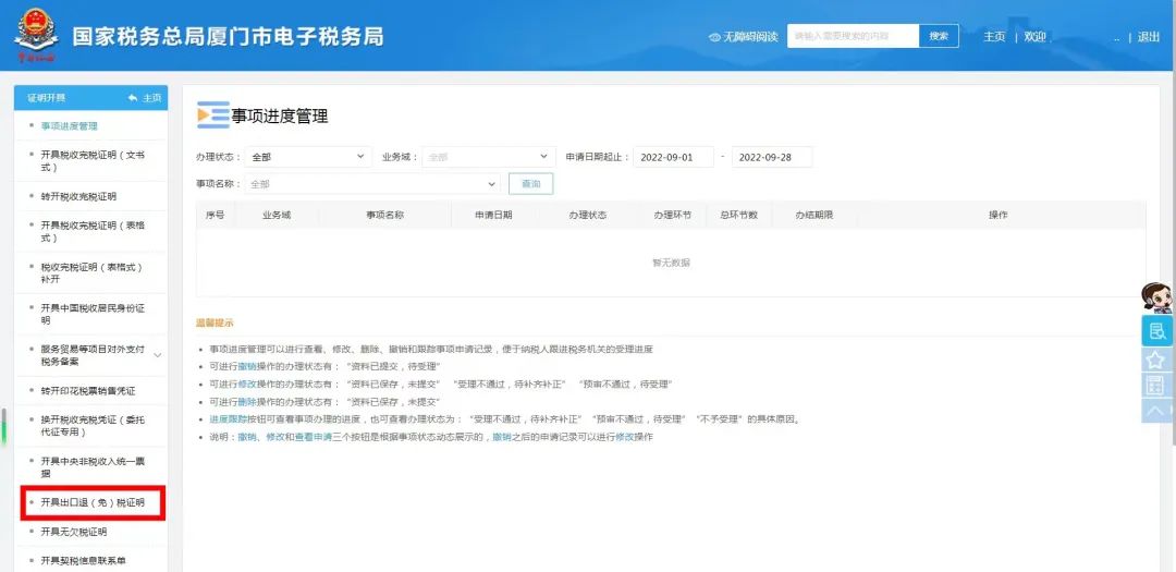 登录厦门市电子税务局,在“我要办税”菜单里选择“证明开具”。