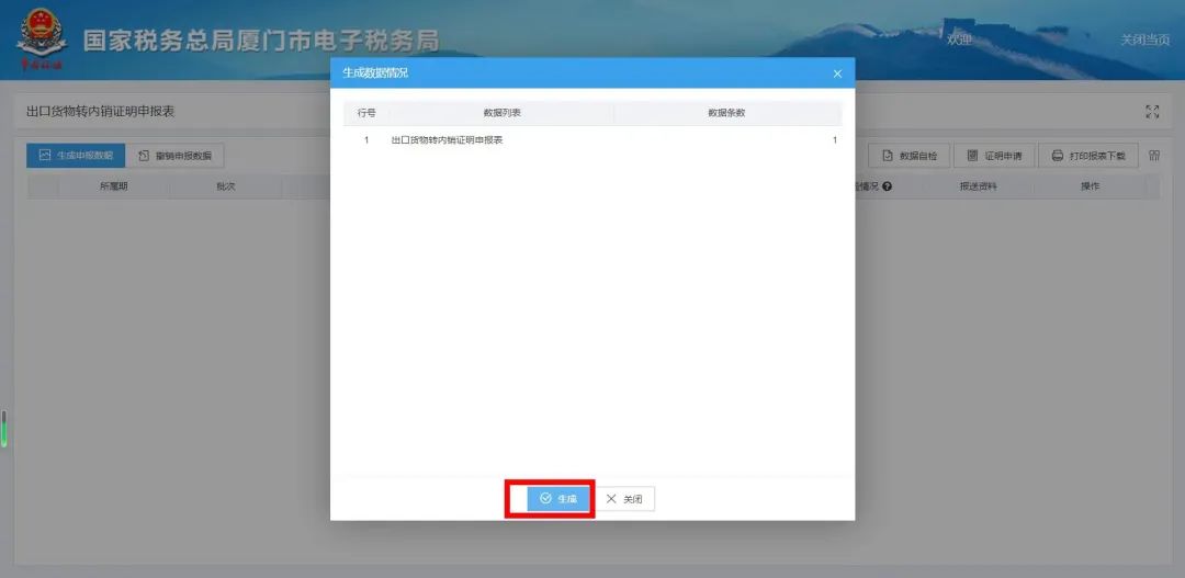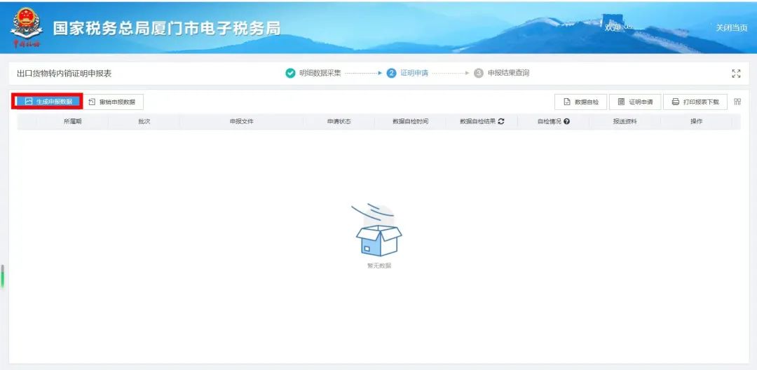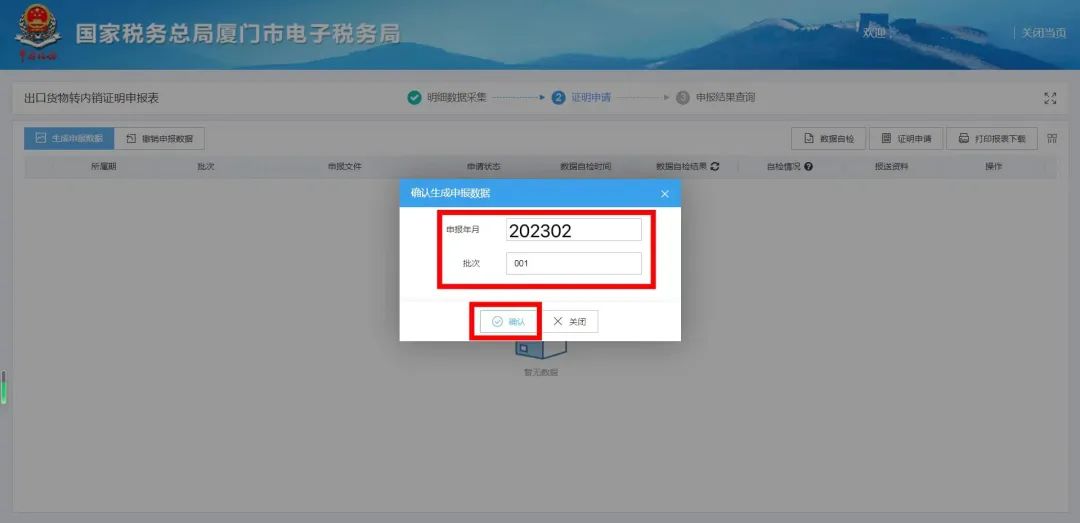 进入“证明申请”界面,点击“生成申报数据”,选择申报年月、批次后,点击“确认”,点击“生成”。