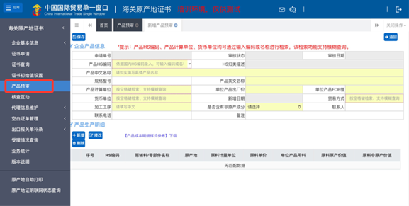 为了方便确认货物原产资格,提升证书审核效率,在申请原产地证书前,货物生产企业可以在“产品预审”模块点击“新增”,提交货物原材料、零部件和加工工序等信息,由企业所属机关进行产品预审,确认货物是否满足相关原产地规则项下原产资格。