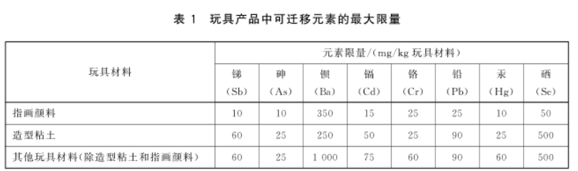 我国对一般玩具材料及造型粘土的特定元素迁移限量要求,同国际标准ISO 8124-3一致;而将指画颜料单独列出,限量要求较普通玩具材料严格2.4-10倍。具体数值参见表1。