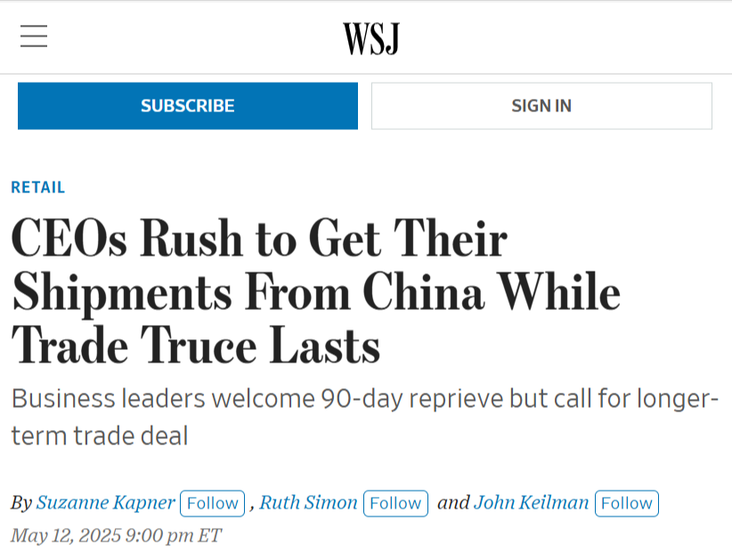 但当他得知特朗普将大幅降低中国进口商品的关税时,迅速蹦下了床,打电话给中国供应商,催促他们立即开始发货。并且表示,“关税生效时我们有数百个集装箱滞留中国,现在它们终于能装船了。”