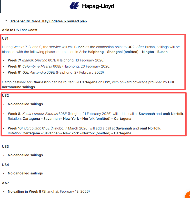 对于美国东海岸,受影响的是US1航线,该航线将在2026年第7、8和9周停靠釜山后结束;以及US2航线,该航线将在第8周停靠萨凡纳并在第10周跳港诺福克。