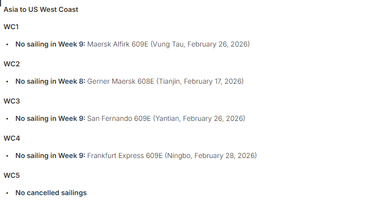 对于西海岸,WC1、WC3和WC4将在第9周停航,而WC2将在第8周停航。亚洲-欧洲航线的停航包括第9周的NE1和NE3,以及第8周将停航的SE1和SE2,SE3则在第9周停航。