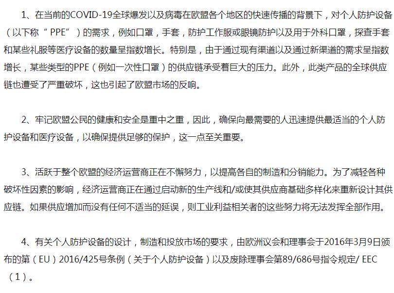 1.为了确保在COVID-19爆发中提供个人防护设备和医疗设备以提供适当的保护,委员会邀请整个供应链中的所有经济运营商以及指定机构和市场监督机构在其部署中采取所有措施处置以支持旨在确保整个欧盟市场的个人防护设备和医疗设备的供应与不断增长的需求相匹配的工作。但是,此类措施不应对整体健康和安全水平产生不利影响,所有相关利益相关方应确保投放到欧盟市场的任何个人防护设备或医疗设备继续为用户提供足够的保护水平' 健康和安全。