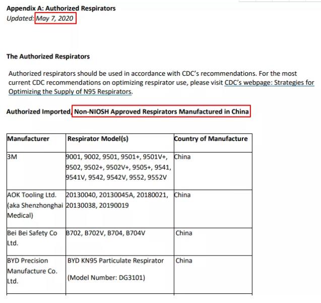 5月7日,美国FDA更新了针对中国生产的未获NIOSH认证的口罩获得EUA授权的文件,获得FDA认可的中国生产的非NIOSH认证的口罩只剩下14个厂家。