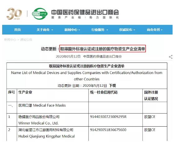 中国医药保健品进出口商会官网于5月12日再次更新了取得国外标准认证或注册的医疗物资生产企业清单与取得国外标准认证或注册的非医用口罩生产企业清单。