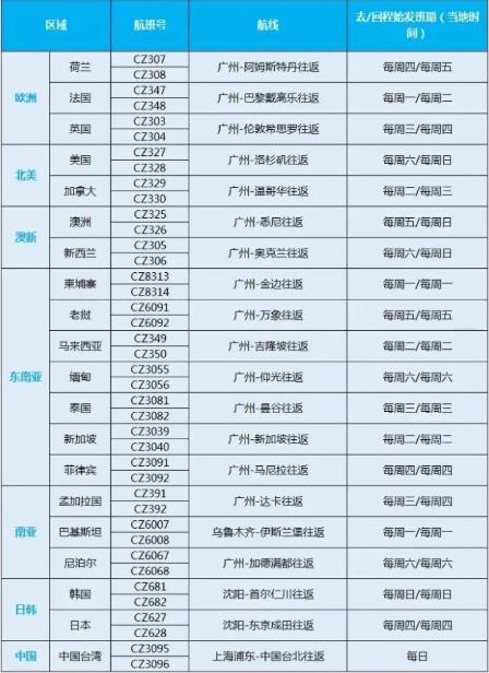 根据南航发布的公告,6月份南航每周可执行国际及地区航线共计20条,其中涉及广州航线16条,沈阳航线2条,乌鲁木齐航线1条,上海浦东航线1条。