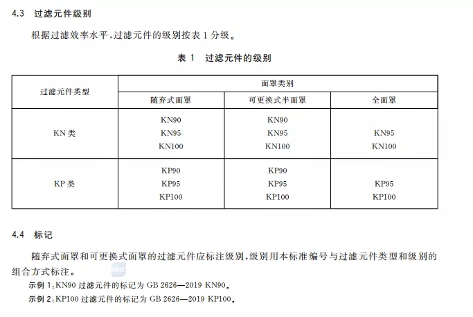 据了解,GB2626-2019该标准第一版为1981年发布(GB2626-1981),1992、2006、2019年分别进行过三次更新,2019版改为“呼吸防护自吸过滤式防颗粒物呼吸器”,不带“用品”二字。相对于2006版,在遵循科学性、规范性、协调性、时效性等基本原则的基础上,根据科学进步和产品发展的趋势,在不降低防护能力的前提下调整呼吸阻力指标,完善检测方法,优化半口罩的下方视野,提高产品的舒适性。在标准中,根据对非油性颗粒物过滤效率水平,过滤元件级别分为KN100、KN95和KN90,对于0.075微米以上的非油性颗粒物过滤效率分别达到99.97%、95%和90%以上,防护等级与过滤效率越高的防尘口罩安全性越高。
