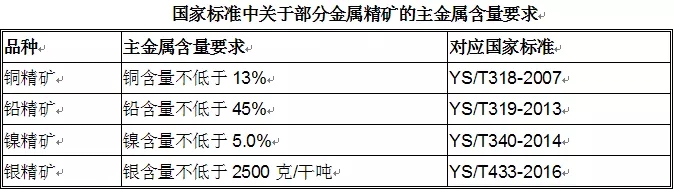 对于含有黄金伴生的上述金属矿,主金属含量需达到对应金属的国家精矿标准方可归入上述商品编码,具体如下: