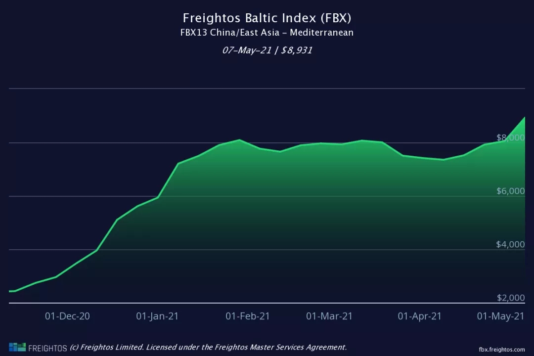最近一期FBX亚洲至地中海的现货运价增长了11%,至每40英尺8931美元。