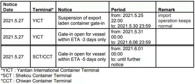 Ocean Network Express (ONE)日前发布公告,随着深圳盐田国际集装箱码头(YICT)堆场密度越来越大,该港口的拥堵正在加剧。其出口进港作业暂停和调整如下: