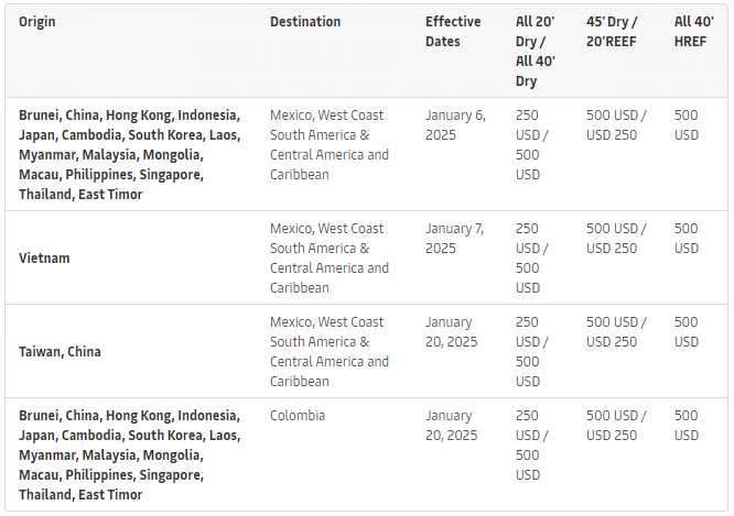 马士基:2025年1月6日起,对从远东到墨西哥、中美洲、南美洲西海岸和加勒比地区的所有干箱征收旺季附加费(PSS)。