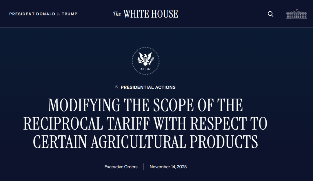 当地时间11月14日,美国总统特朗普签署行政令,从美国东部时间11月13日起不再对部分农产品征收所谓“对等关税”。受调整商品达237种,从橙子、巴西莓、辣椒粉到可可粉、食品生产用化学品、化肥等,此前许多品类在美国的价格同比涨幅已达两位数。此外,美国白宫网站11月14日发布美国与瑞...